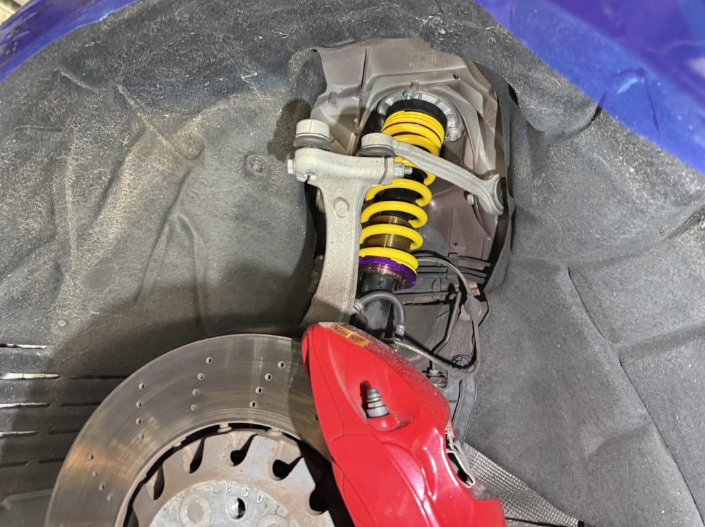 ダンパーに油圧が繋がっていて車体から切り離さずに交換をしますので少し特殊です。